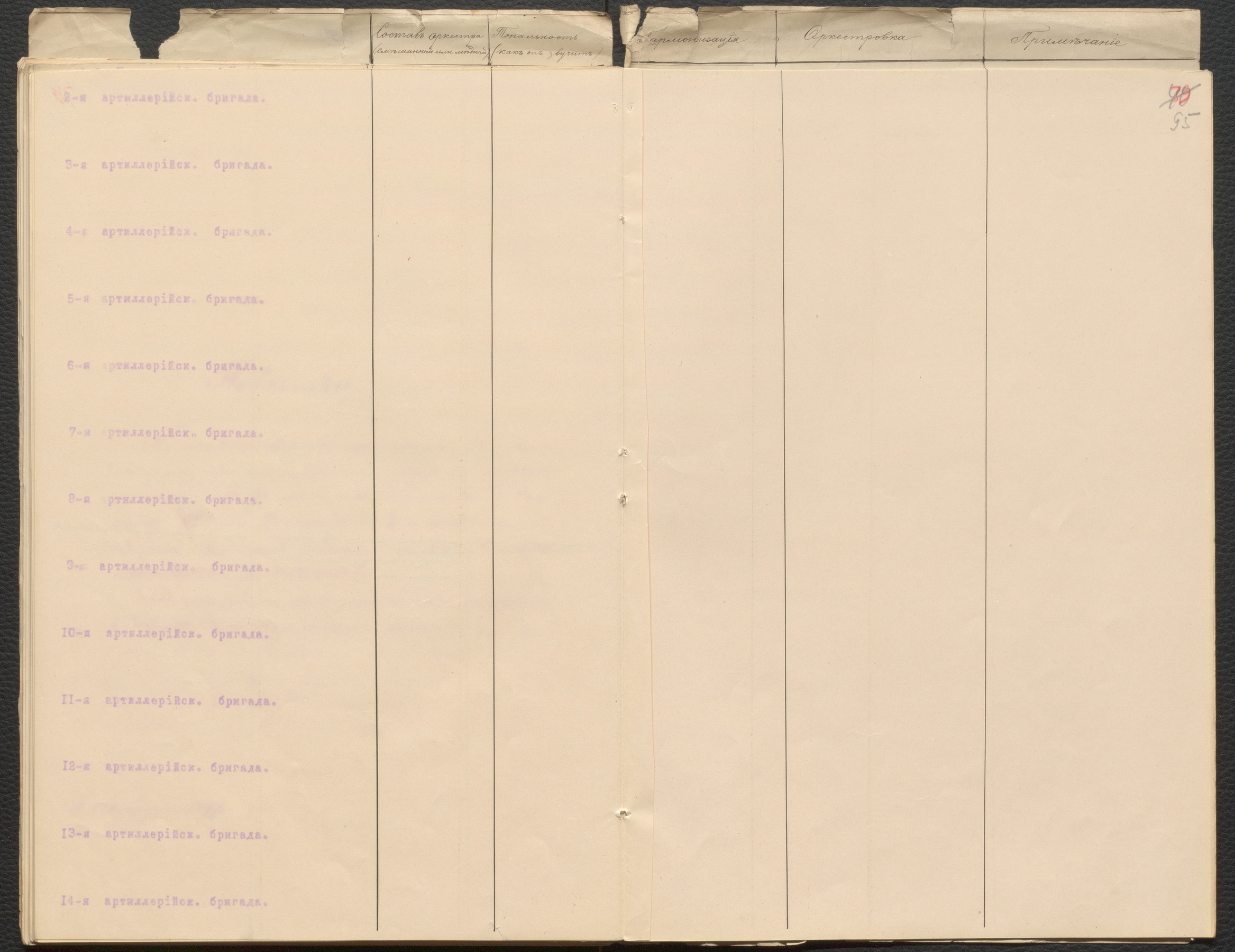 На л. 56–102 таблица с анализом качества партитур гимна в воинских подразделениях Российской императорской армии. 1914–1915. Машинопись с рукописными вставками.