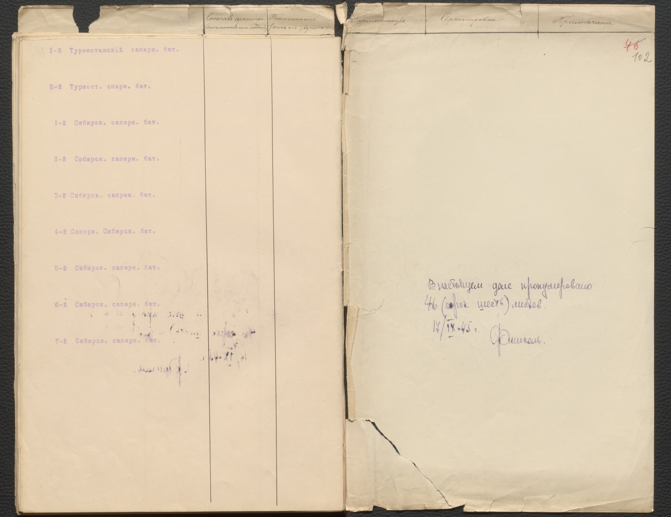 Л. 56–102 (таблица) имеют внутреннюю полистную нумерацию красным карандашом в правом верхнем углу листов. На л. 102 рукописная заверительная запись: «В настоящем деле пронумеровано 46 (сорок шесть) листов. 17/IX-45 г. Финкель».