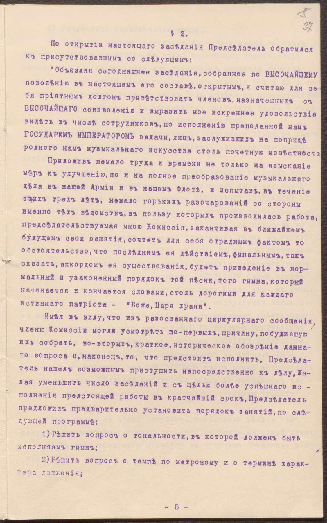 Материалы состоящей при Военно-походной канцелярии Е. И. В. Николая II Комиссии по улучшению музыкального дела в Армии и во Флоте под руководством барона К. К. Штакельберга, посвященные рассмотрению народного гимна. Рукописи, литографированные рукописи, машинопись, типографский оттиск, нот-ные издания. 1884; 1914–1915. КР РИИИ. Ф. 35. Оп. 1. Ед. хр. 57. 105 л.