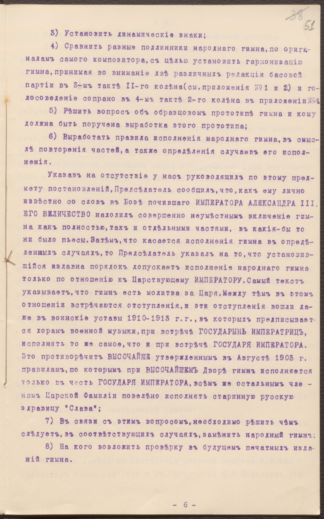 На л. 1–2 об. циркулярное письмо членам Комиссии по рассмотрению народного гимна с грифом «Председатель состоящей при Военно-походной канцелярии Его Императорского Величества высочайше утвержденной Комиссии по улучшению музыкального дела в Армии и во Флоте» с датировкой «Января 1914», с просьбой ознакомиться с семью приложениями (копии рукописных и печатных партитур гимна для разных составов исполнителей). Типографский оттиск.